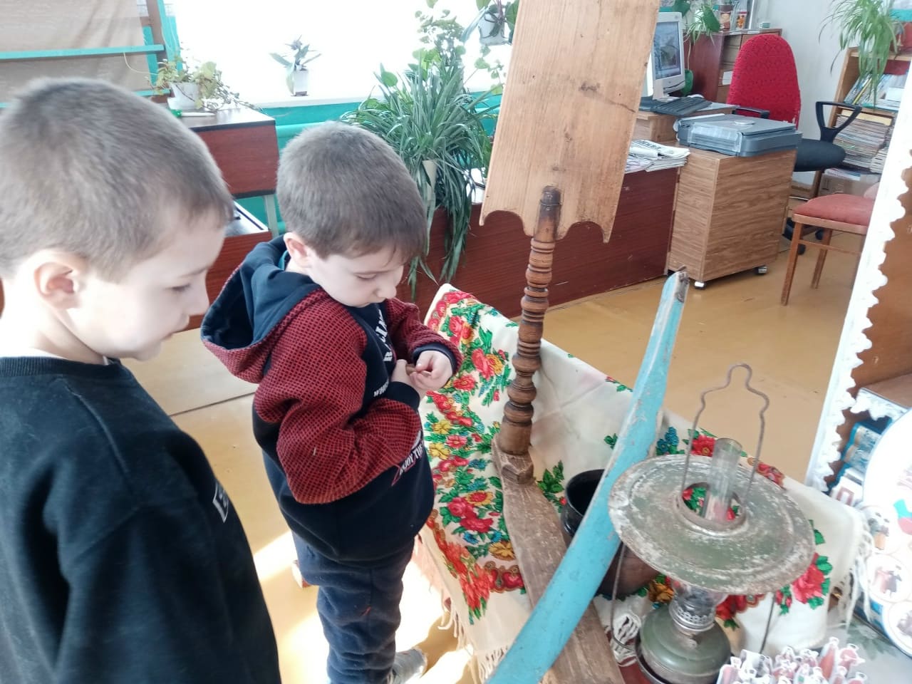Далее последовал этап демонстрации экспонатов, представляющих собой артефакты из фонда библиотеки. Дети с интересом изучали старинные предметы быта, такие как предметы кухонной утвари, инструменты и элементы одежды. Библиотекарь стимулировала их к аналитическому мышлению, предлагая объяснить функциональное назначение каждого предмета и его роль в повседневной жизни наших предков.